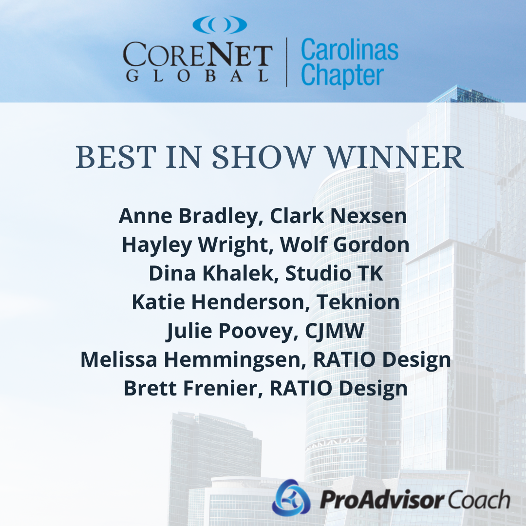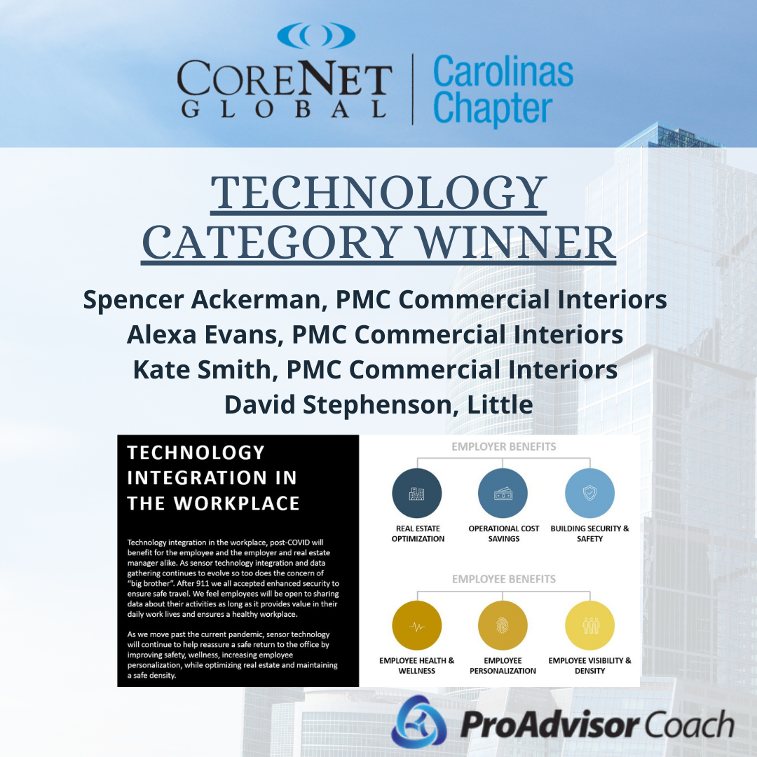 As we start to plan for a post-COVID world with new ways of working, CoreNet Carolinas wants to advance thinking of future office design through showcasing chapter talent and thought leadership. The chapter held a competition in February 2021 where teams of 2-5 people, of which at least one person was a CoreNet Carolinas member and all of whom work in the Carolinas shared their vision of what the office will look like Post- COVID. There were three categories the teams could choose: Design, Technology and Employee Experience. The judges, listed below, reviewed the submissions and rated the videos based on the requirements to submit. Was the solution creative and unique? Is the solution thorough and complete? Is the idea communicated clearly and effectively? The winners and runner up submissions were shown at the chapter's March 11 program. During this event, the attendees were able to vote for the Best in Show Winner. All winners and their videos are listed below.
