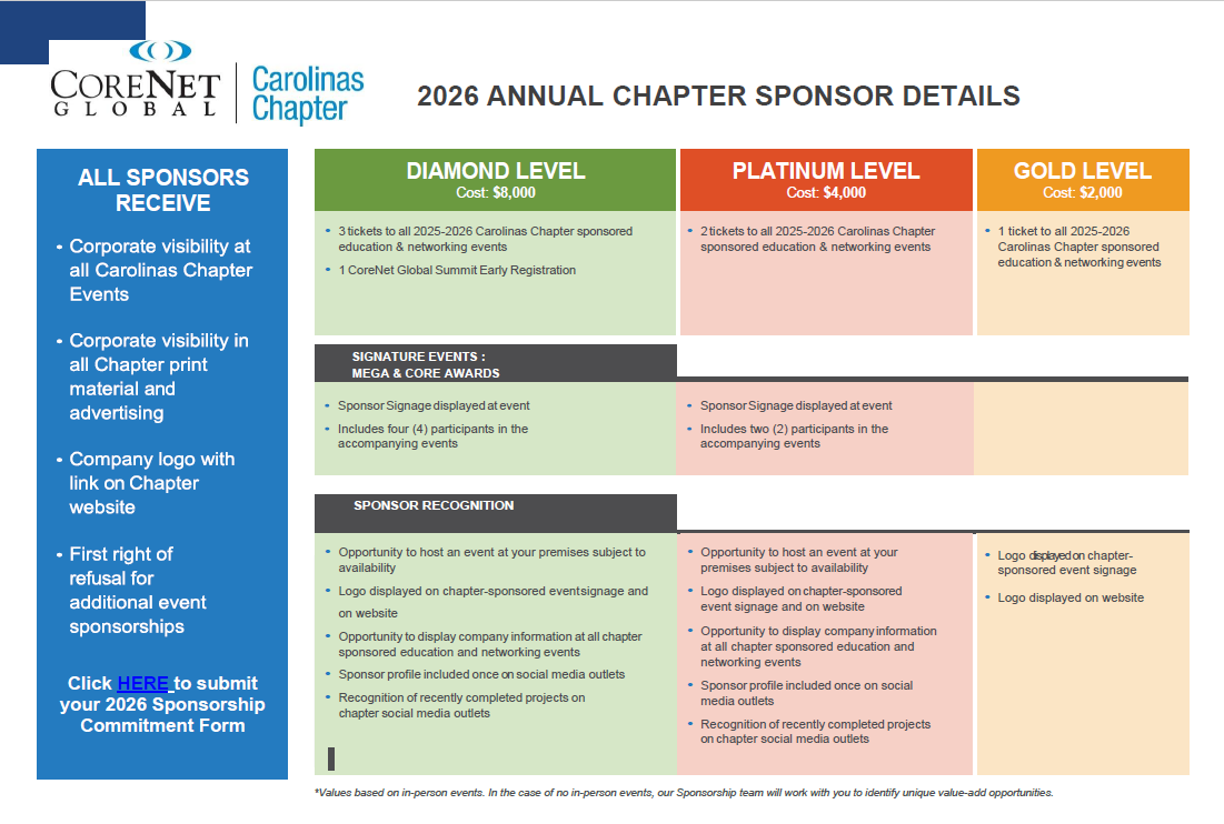 The Carolinas Chapter members are the best in their respective roles in the industry. Being a sponsor means that your organization has the opportunity to network with the innovators and thought leaders. Your organization benefits by getting insight into what our members think on current issues, what challenges they face, and how they approach their work. Your organization can use this insight to better target your audiences and hone your product and service offerings.